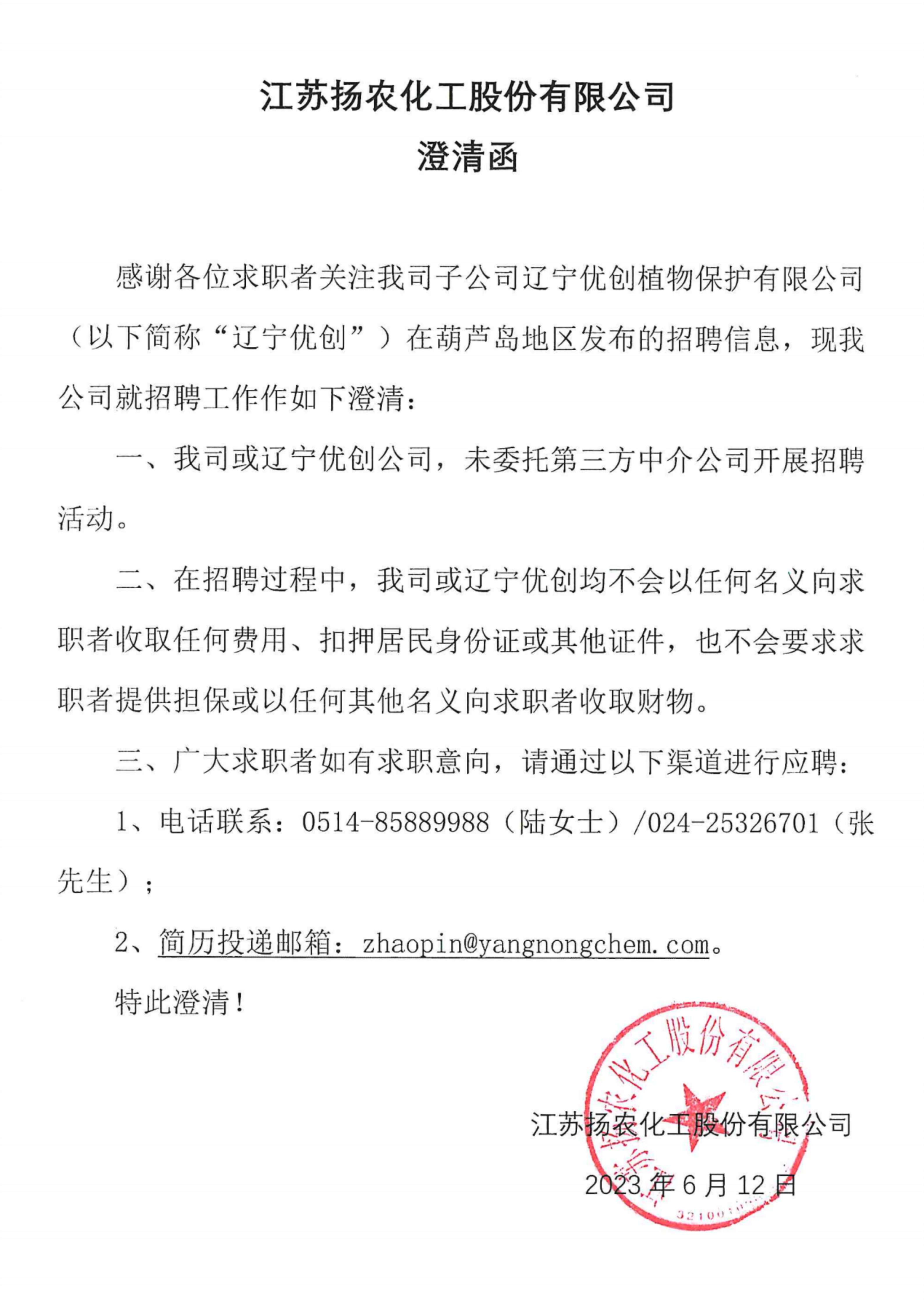 关于我司在辽宁葫芦岛地区招聘工作澄清函