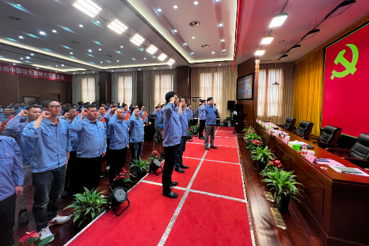 吴孝举领誓,20名新党员面对鲜红党旗,许下对党的誓言,全体参会党员重温入党誓词。