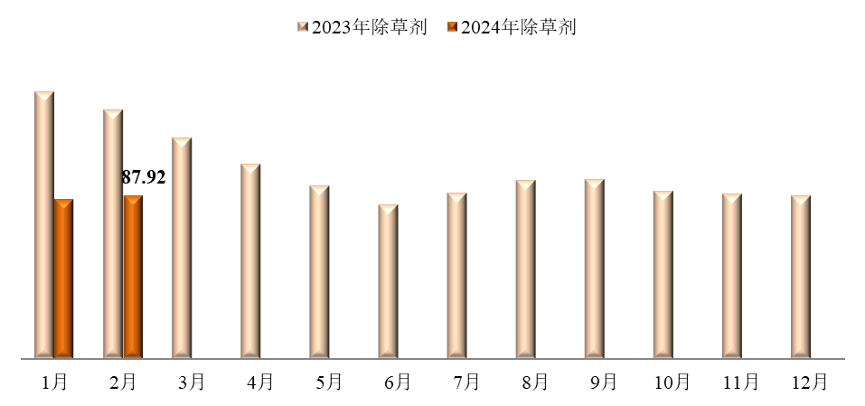 除草剂价格指数为87.92,环比上涨2.34%,同比下跌34.91%。监测在内的36种除草剂产品中,加权平均成交价格环比上涨的24种,环比下跌的12种;加权平均成交价格同比上涨的2种,同比下跌的34种。