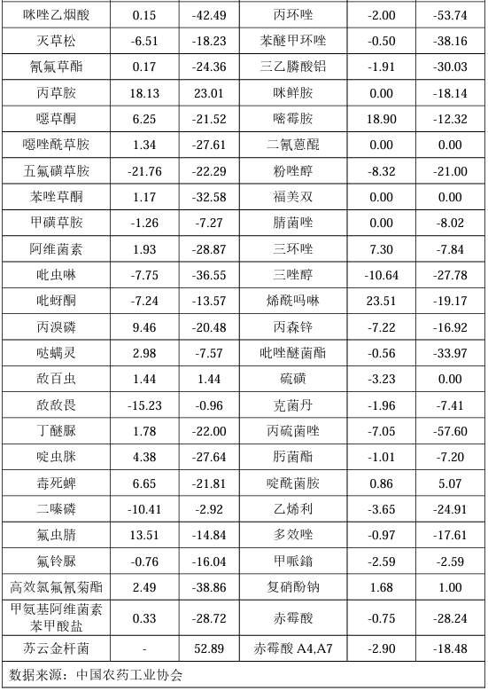 杀菌剂价格指数为88.38,环比上涨3.70%,同比下跌21.08%。监测在内的36种杀菌剂和植物生长调节剂产品中,加权平均成交价格环比上涨的10种,环比持平的4种,环比下跌的20种;加权平均成交价格同比上涨的3种,同比持平的3种,同比下跌的28种。