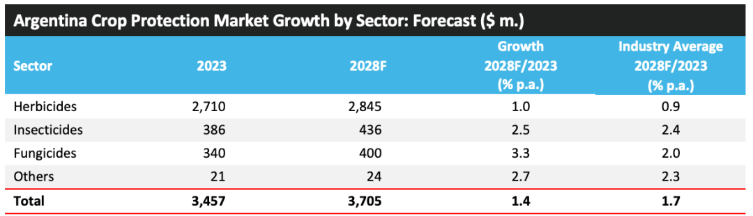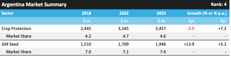 2023 年,阿根廷的作物保护产品市场规模达到 34.57 亿美元,比上一年下降了 2.5%。在此水平上,就作物保护产品市场价值而言,该国在 2023 年排名第四。