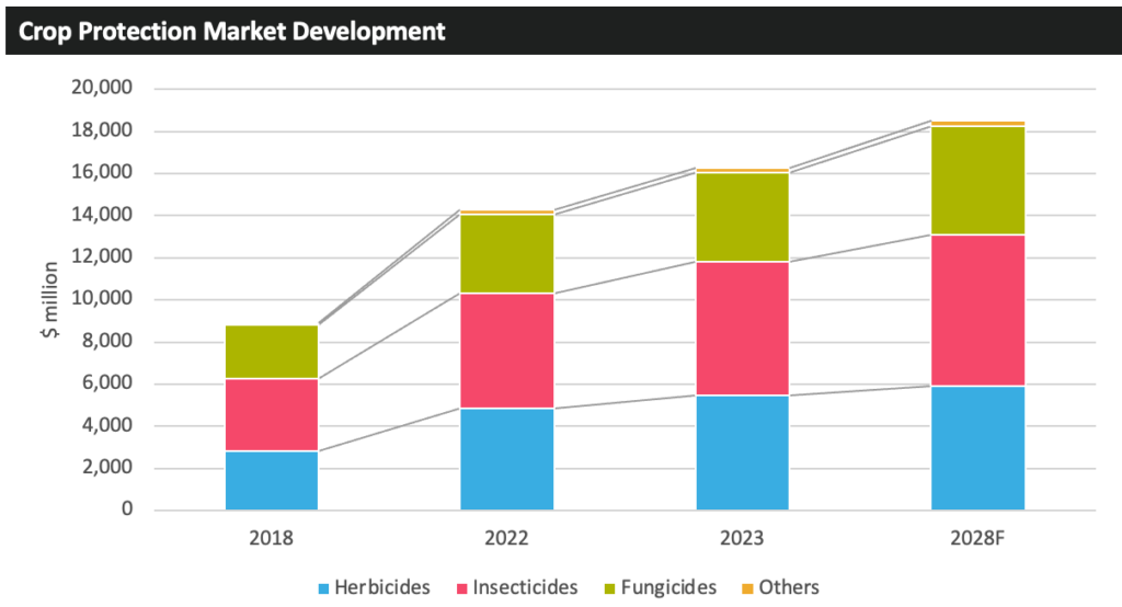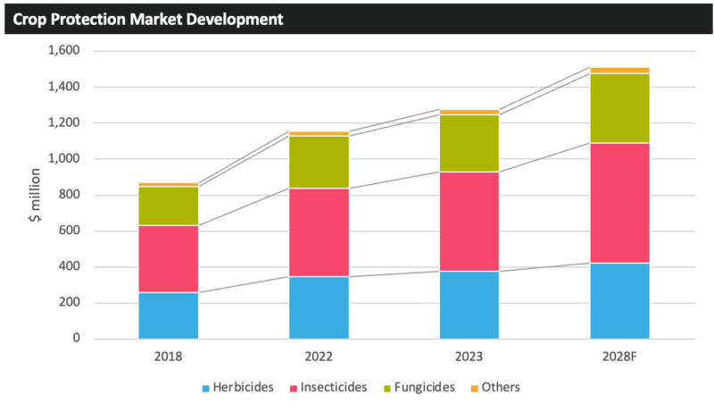 近年来,人们对水果和蔬菜生产的日益关注使作物保护市场受益,预计未来几年该行业将继续扩张。大量生物作物保护产品的推出也有望推动增长,该行业将快速扩张,超过传统作物保护产品的预期增长率。
