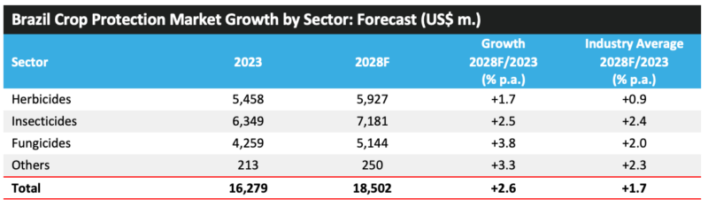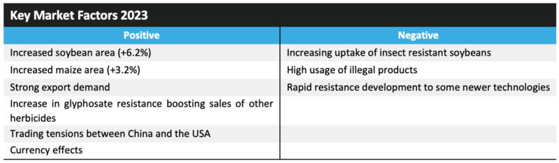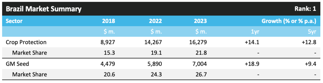 2023 年,巴西作物保护市场价值增长了 14.1%,达到 162.79 亿美元。这种强劲的增长水平是由 2022 年 7 月至 2023 年 6 月农业年度期间的高农药价格、持续强劲的农业经济、主要作物种植面积增加以及北部地区相对较高的害虫压力所驱动,在北部地区,潮湿的天气有利于疾病的发展。对于大豆来说,该地区受益于对可出口产品的强劲需求,特别是来自中国的需求。此外,巴西雷亚尔的贬值增加了巴西大豆的吸引力。巴西玉米种植面积也有所增加,因为种植者希望利用高玉米交易价格获利。