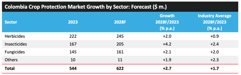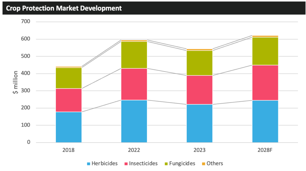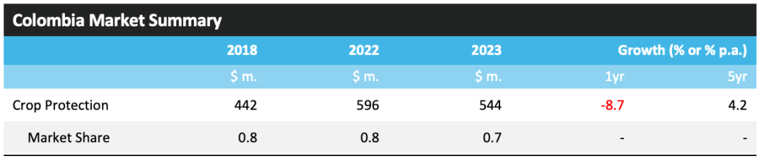 该国对谷物和油料种子的关注较少,而倾向于水果和蔬菜,这意味着种植者对主要农作物商品的价格波动不太敏感。2023年,哥伦比亚作物保护市场的价值下降了 8.7%,总计 5.44 亿美元。