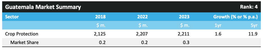 危地马拉仍然是一个处于发展早期阶段的国家,农业在国内生产总值中占很大份额(13.3%),在出口收入中也占很大份额(32%)。农业在两个方面发展:高质量的水果和蔬菜生产,主要用于出口,以及种植园作物——而不是那么多用于玉米、豆类和大米等主要农作物的生产。该国的劳动力成本仍然很低,这使其在出口市场上具有价格竞争力。以美元/公顷为基础的农药平均支出相对较高,这可能是由于水果和蔬菜在市场中所占份额较大。