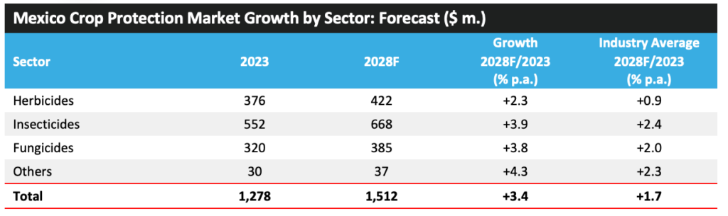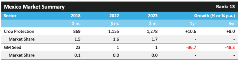 2023 年,墨西哥的作物保护市场增长了 10.6%,达到 12.78 亿美元。在这个水平上,就作物保护销售额而言,该国在 2023 年排名第十三。