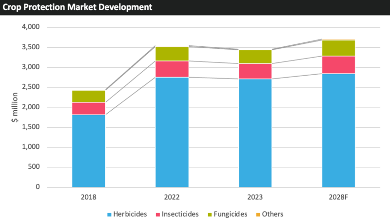 从更积极的方面来看,害虫压力相对较高,包括亚洲大豆锈病和一些重大害虫。然而,恶劣的天气条件和玉米种植面积减少对市场发展是严重的不利因素。对于 2025 年,虽然农药价格和商品价格按照历史标准仍然较低,但主要农作物种植面积增加的预测以及对天气条件改善的期望将对市场发展有利。虽然农药价格仍然相对较低,但现在波动性较小,这种稳定性应能防止因价格侵蚀而导致市场进一步收缩。