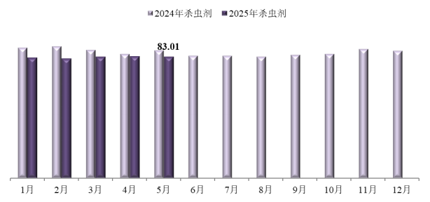 5月,杀虫剂价格指数为83.01,环比下跌0.24%,同比下跌4.76%。监测在内的37种杀虫剂产品中,加权平均成交价格环比上涨的17种,环比持平的1种,环比下跌的18种;加权平均成交价格同比上涨的11种,同比下跌的26种。