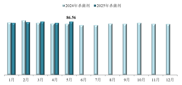 5月,杀菌剂价格指数为86.56,环比上涨2.37%,同比上涨4.31%。监测在内的32种杀菌剂产品中,加权平均成交价格环比上涨的13种,环比持平的4种,环比下跌的13种;加权平均成交价格同比上涨的12种,同比持平的1种,同比下跌的17种。