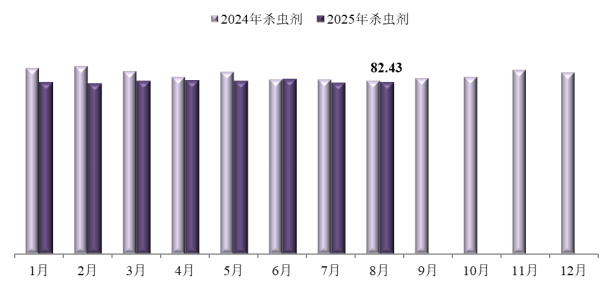 8月,杀虫剂价格指数为82.43,环比上涨0.42%,同比下跌0.63%。监测在内的36种杀虫剂产品中,加权平均成交价格环比上涨的12种,环比持平的2种,环比下跌的21种;加权平均成交价格同比上涨的12种,同比下跌的23种。